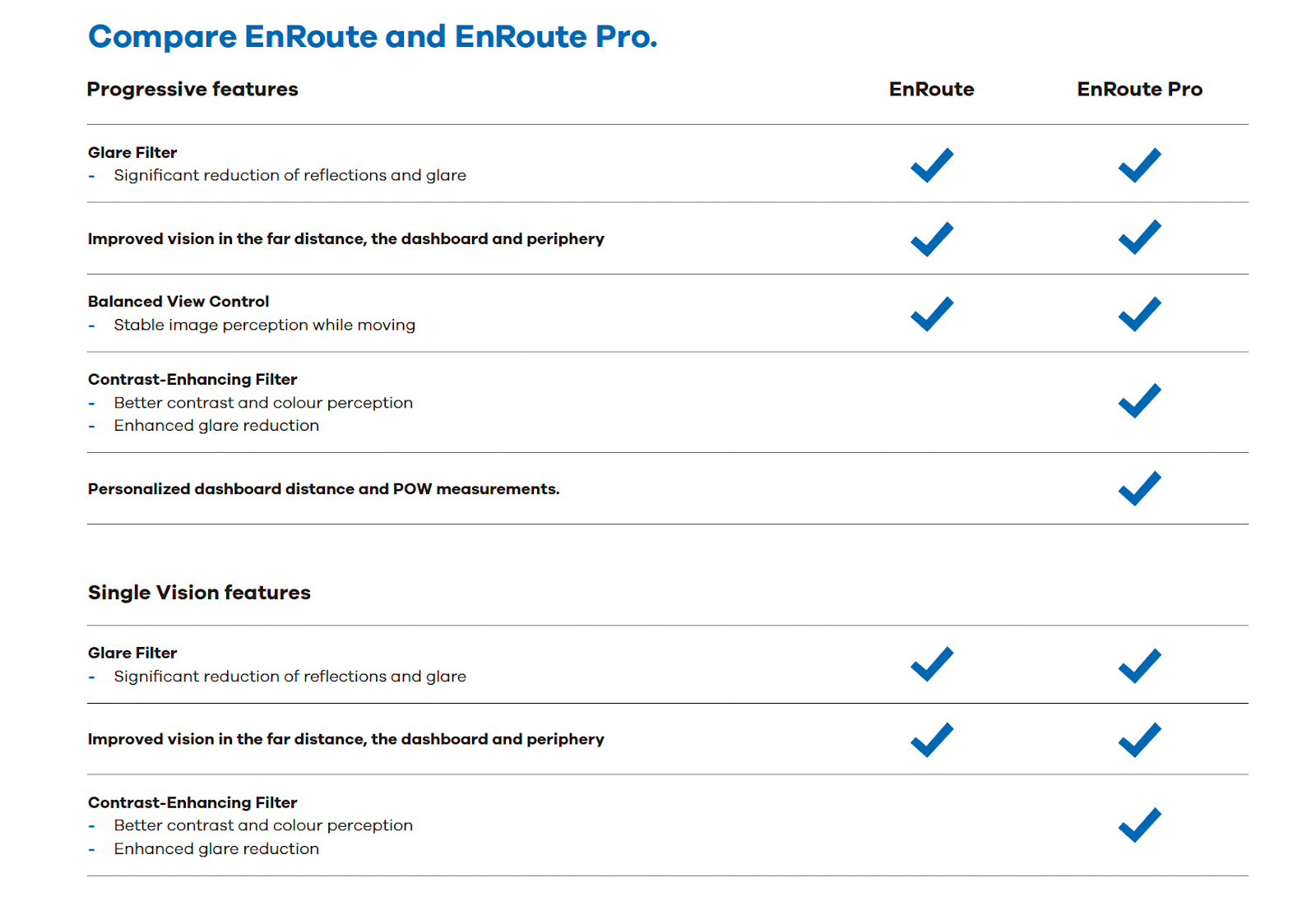 Both EnRoute and EnRoute Pro are designed to enhance comfort, clarity, and safety for drivers—and both are available as single vision and progressive lenses. This comparison chart highlights the unique features of each option, so you can help patients choose the lens that best fits their needs.