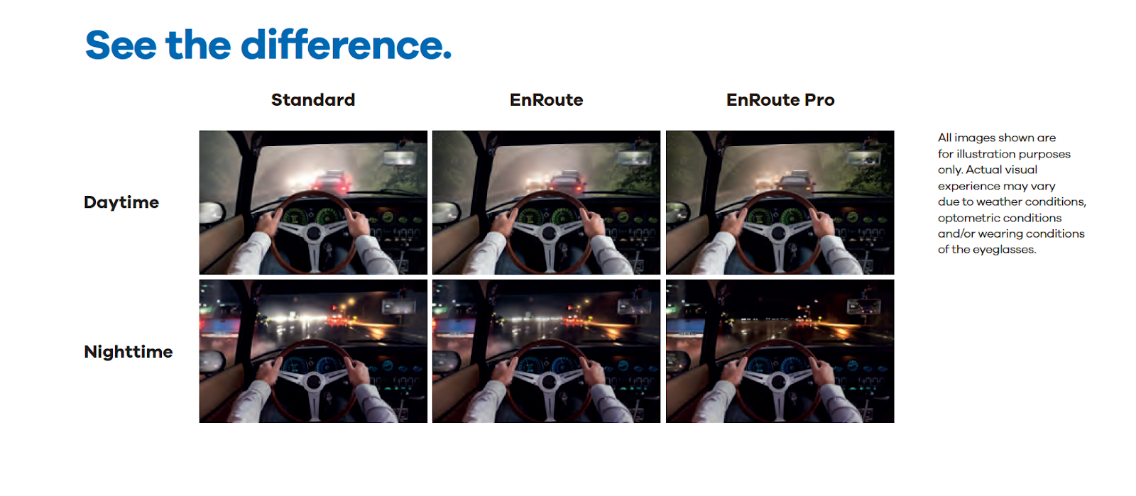 Vision plays a key role in driving safety—studies show that 90% of a driver’s reaction time relies on vision.² EnRoute lenses are engineered specifically for drivers, addressing the visual stress and glare that can make driving tiring or uncomfortable.